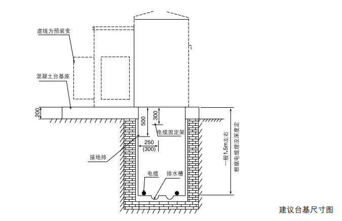 組合式變電站安裝在水平混凝土臺(tái)面上,臺(tái)面應(yīng)保證承受其重量.建議臺(tái)基尺寸 ( 見下圖 )