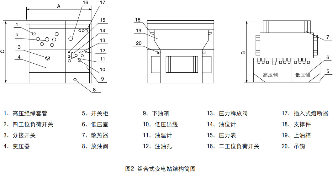 產(chǎn)品結(jié)構(gòu)特點(diǎn)(原理圖見圖1、結(jié)構(gòu)圖見圖2) 變壓器器身與高壓開關(guān)設(shè)備分油箱裝配,兩者僅電氣連接而油相互隔離。帶電操作負(fù)荷開關(guān)產(chǎn)生的電弧只能使負(fù)荷開關(guān)油箱中的油變黑甚碳化而不影響變壓器中油的質(zhì)量。損耗小、過載能力強(qiáng)??捎糜诃h(huán)網(wǎng)供電、雙電源供電或終端供電系統(tǒng)中,供電方式轉(zhuǎn)換方便、運(yùn)行可靠。 本產(chǎn)品具有缺相保護(hù)裝置,當(dāng)缺相時(shí),可自動(dòng)同時(shí)斷開變壓器的進(jìn)線負(fù)荷開關(guān)和低壓側(cè)斷路器(總開關(guān)),也可只斷開高壓側(cè)負(fù)荷開關(guān)或低壓側(cè)斷路器。 |